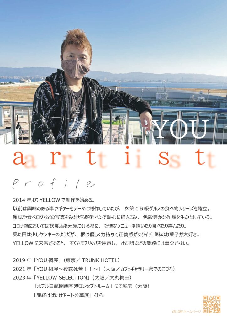YOUさんの作品の特徴は、ポスターカラーマーカーで描かれること。題材は食品、自動車、ギター、街並み等様々ですが、独特な感性で描かれる作品は大変印象的で、個性的な色彩感覚と才能を感じます。